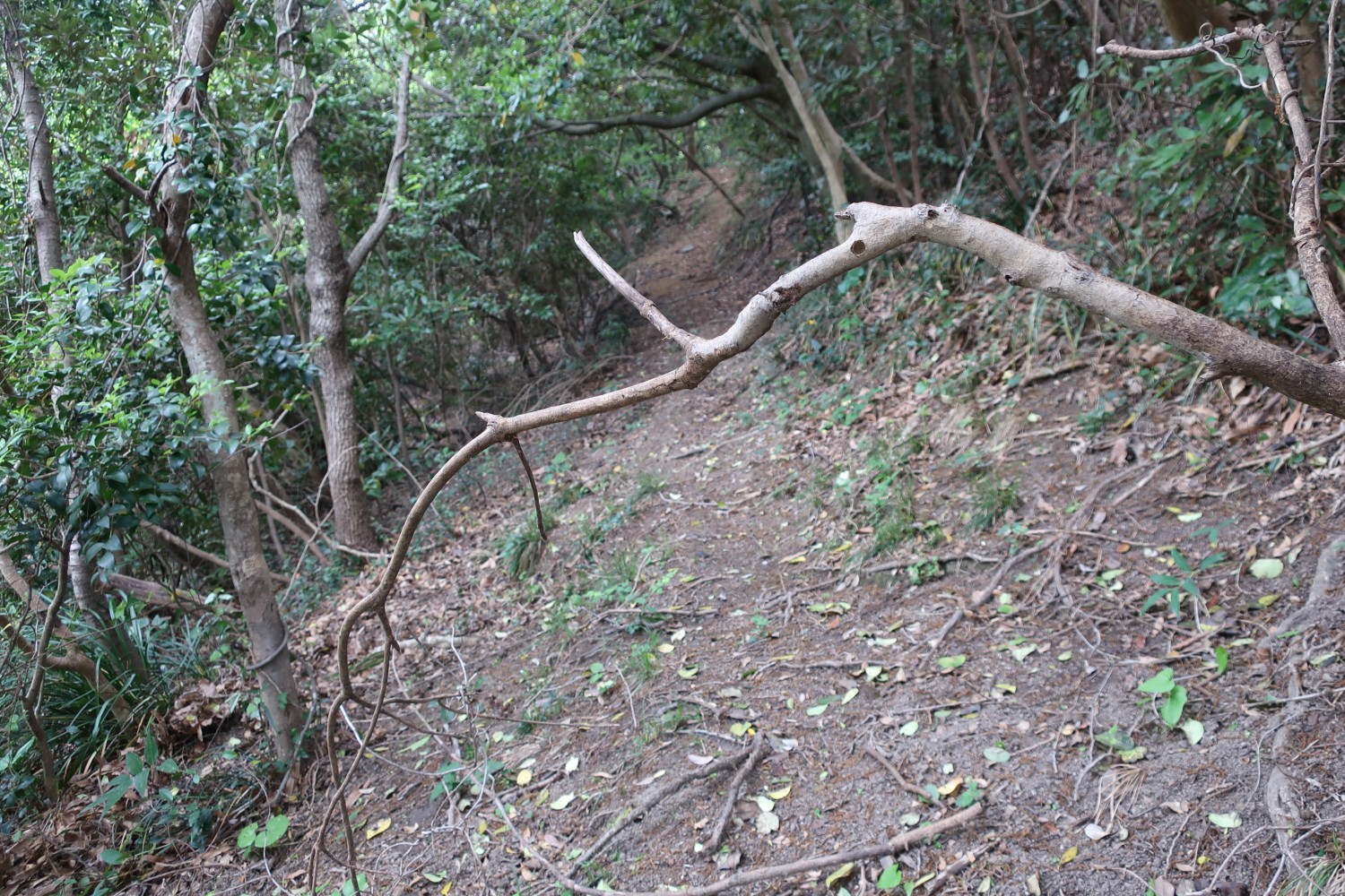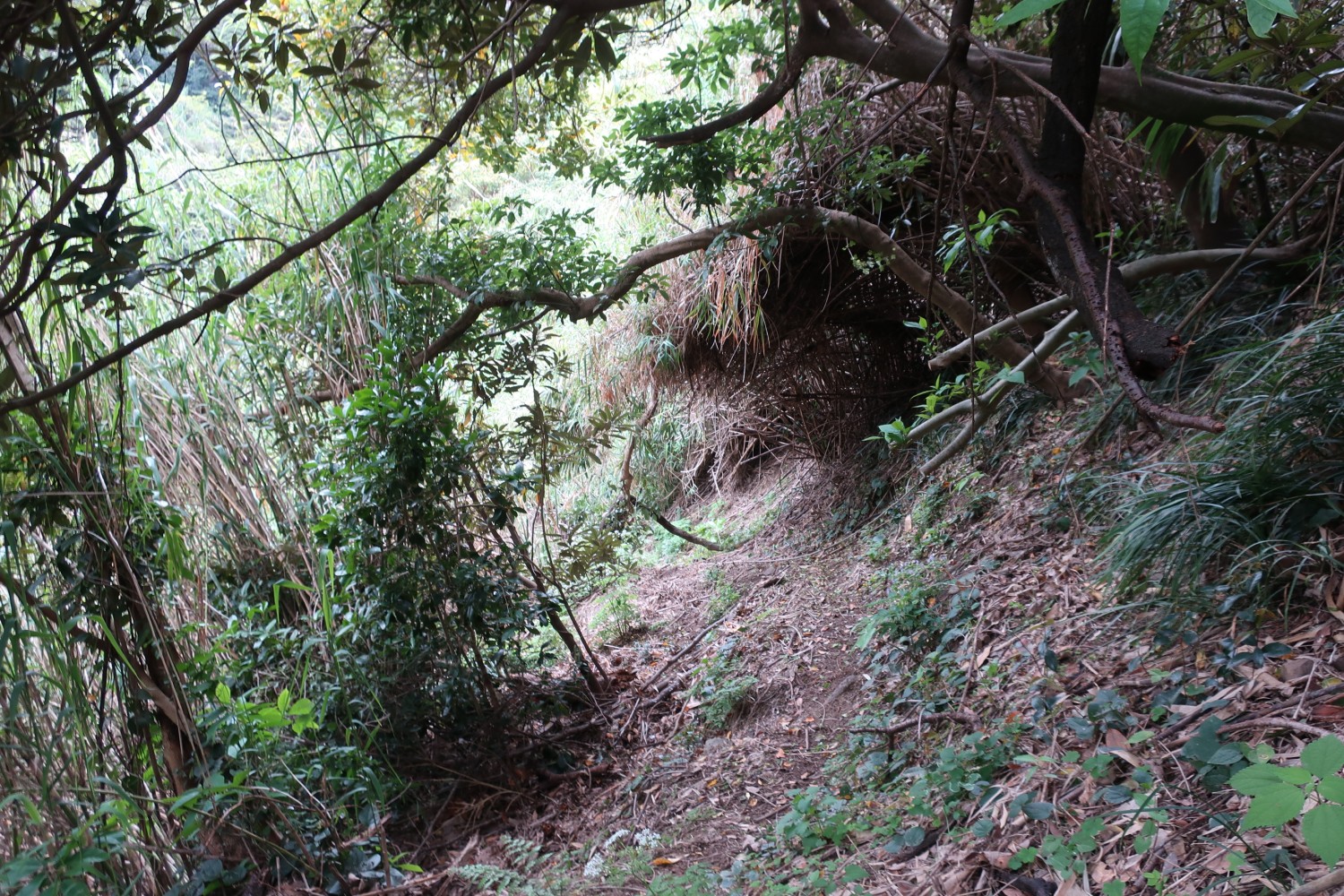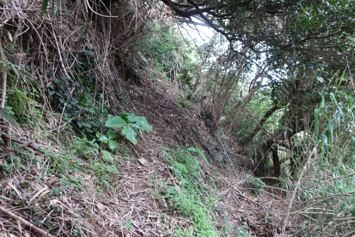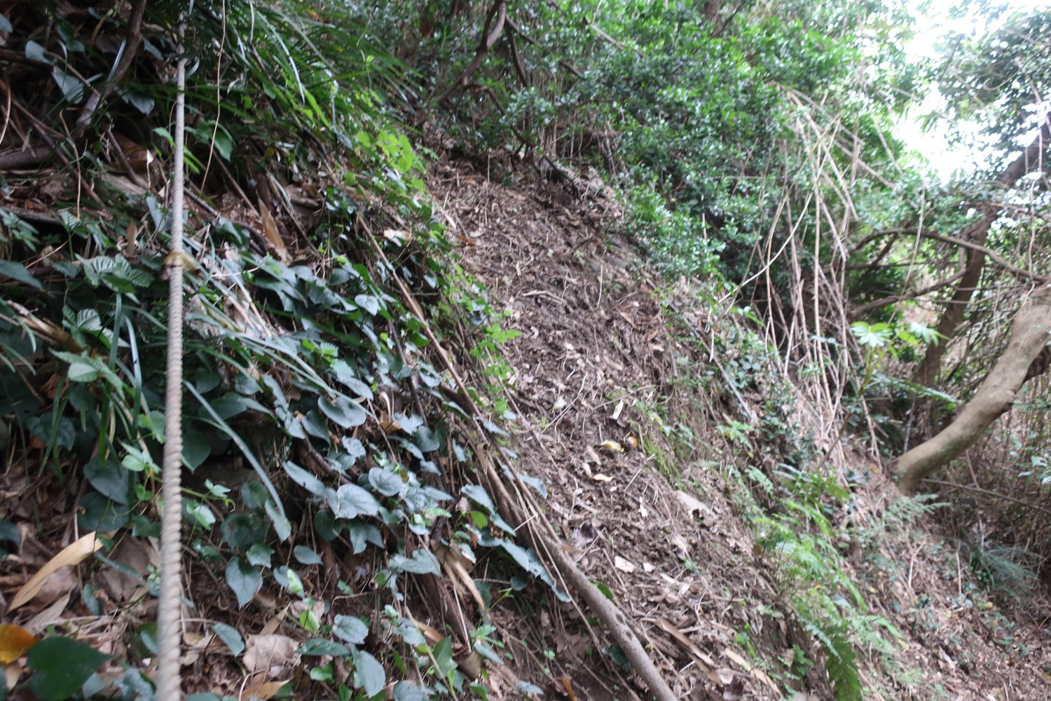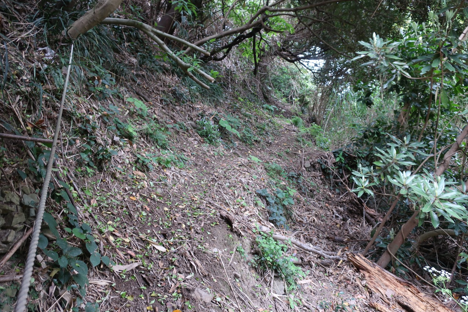 ここでは左が崖下、右が崖上だが、考えてみると、ここまでずっと左が崖上、右が崖下だったように思う。とすると、上掲した国土地理院の地図でつづらおりに描かれている部分は、もっとまっすぐなんだろう(国土地理院の地図の徒歩道はそれほど正確ではないことがある)。きついわけだ。