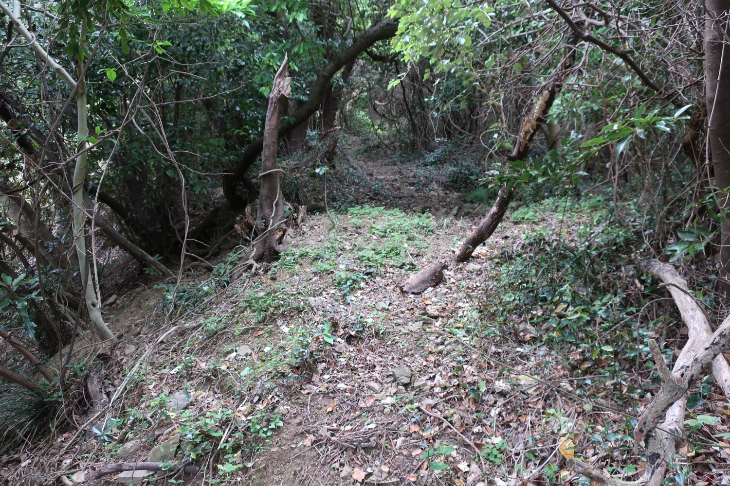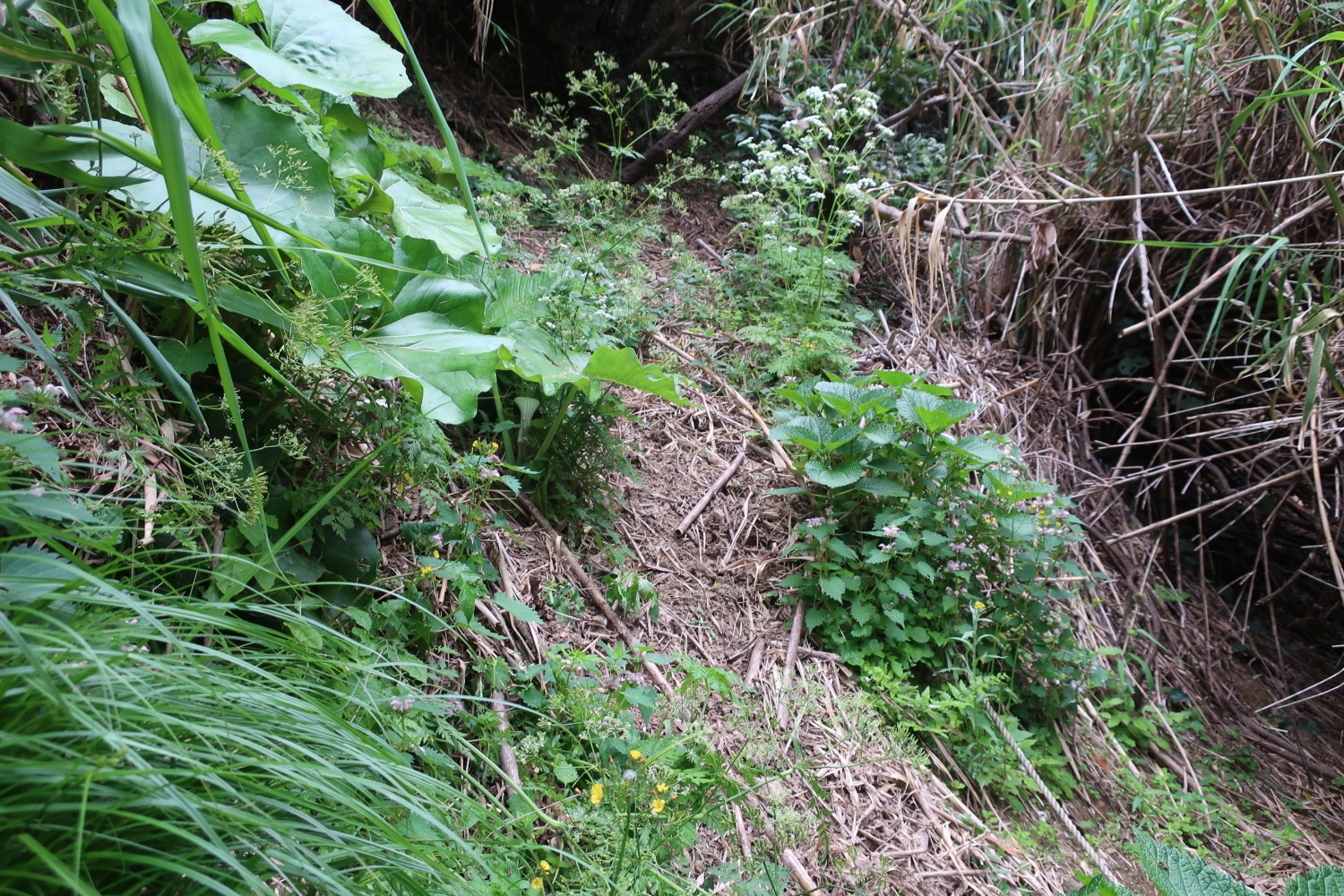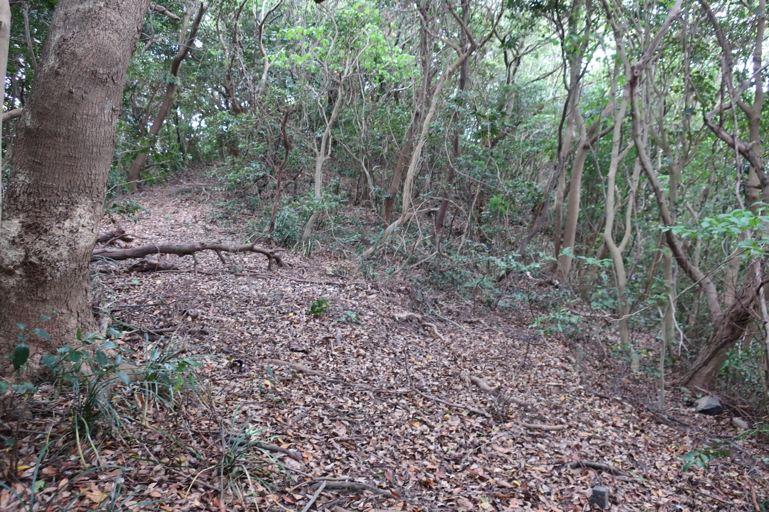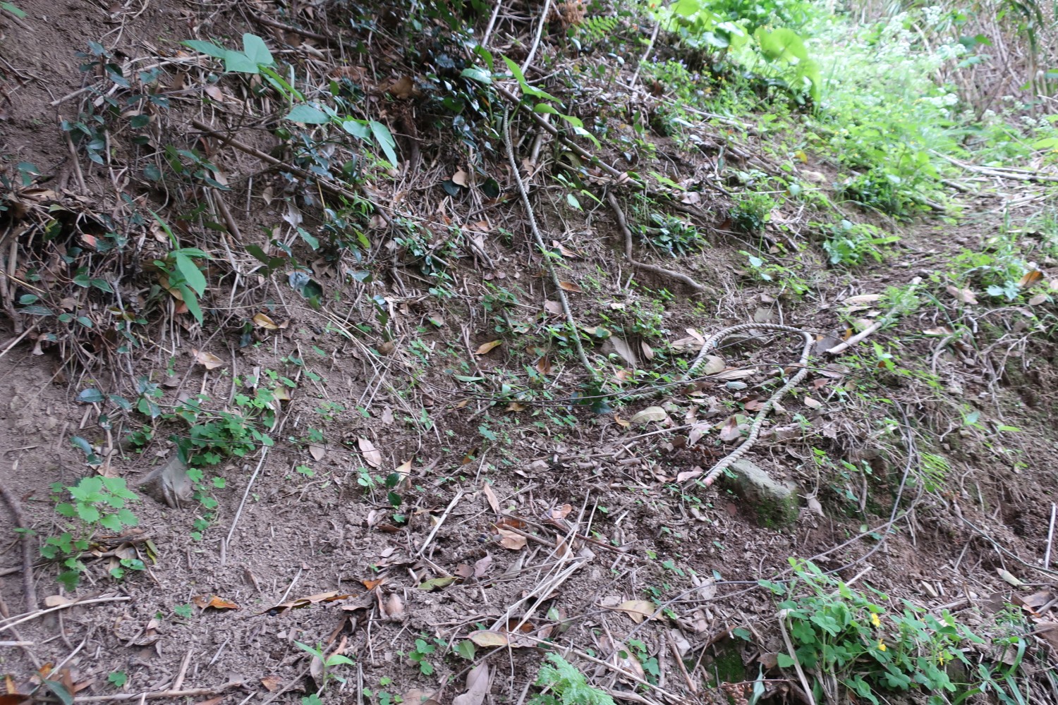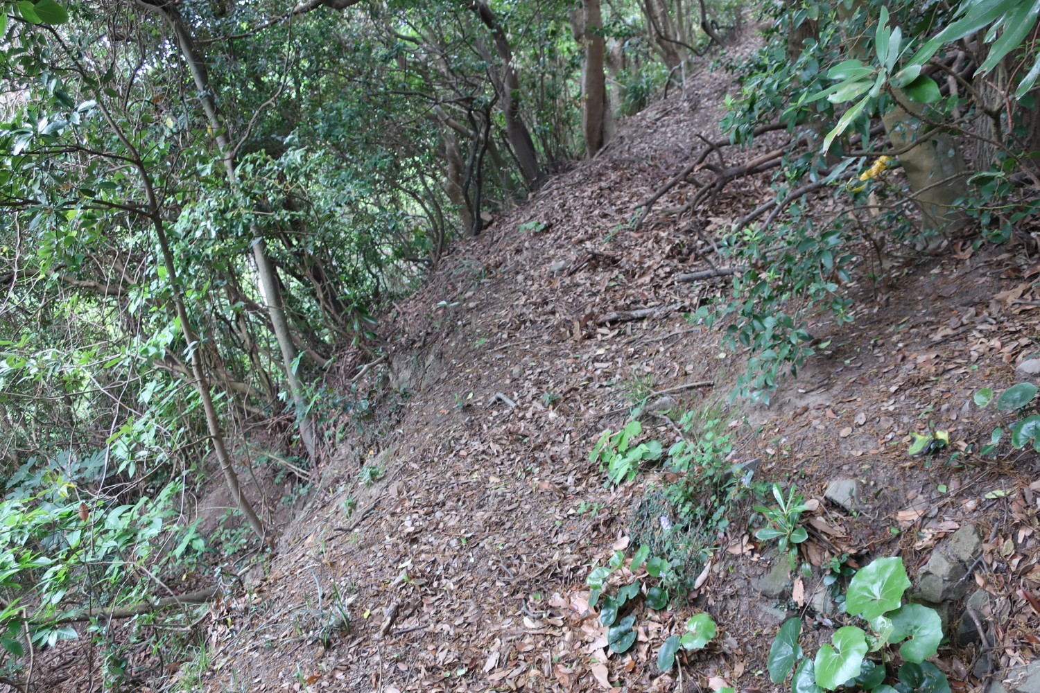 ここでは左が崖下、右が崖上だが、考えてみると、ここまでずっと左が崖上、右が崖下だったように思う。とすると、上掲した国土地理院の地図でつづらおりに描かれている部分は、もっとまっすぐなんだろう(国土地理院の地図の徒歩道はそれほど正確ではないことがある)。きついわけだ。