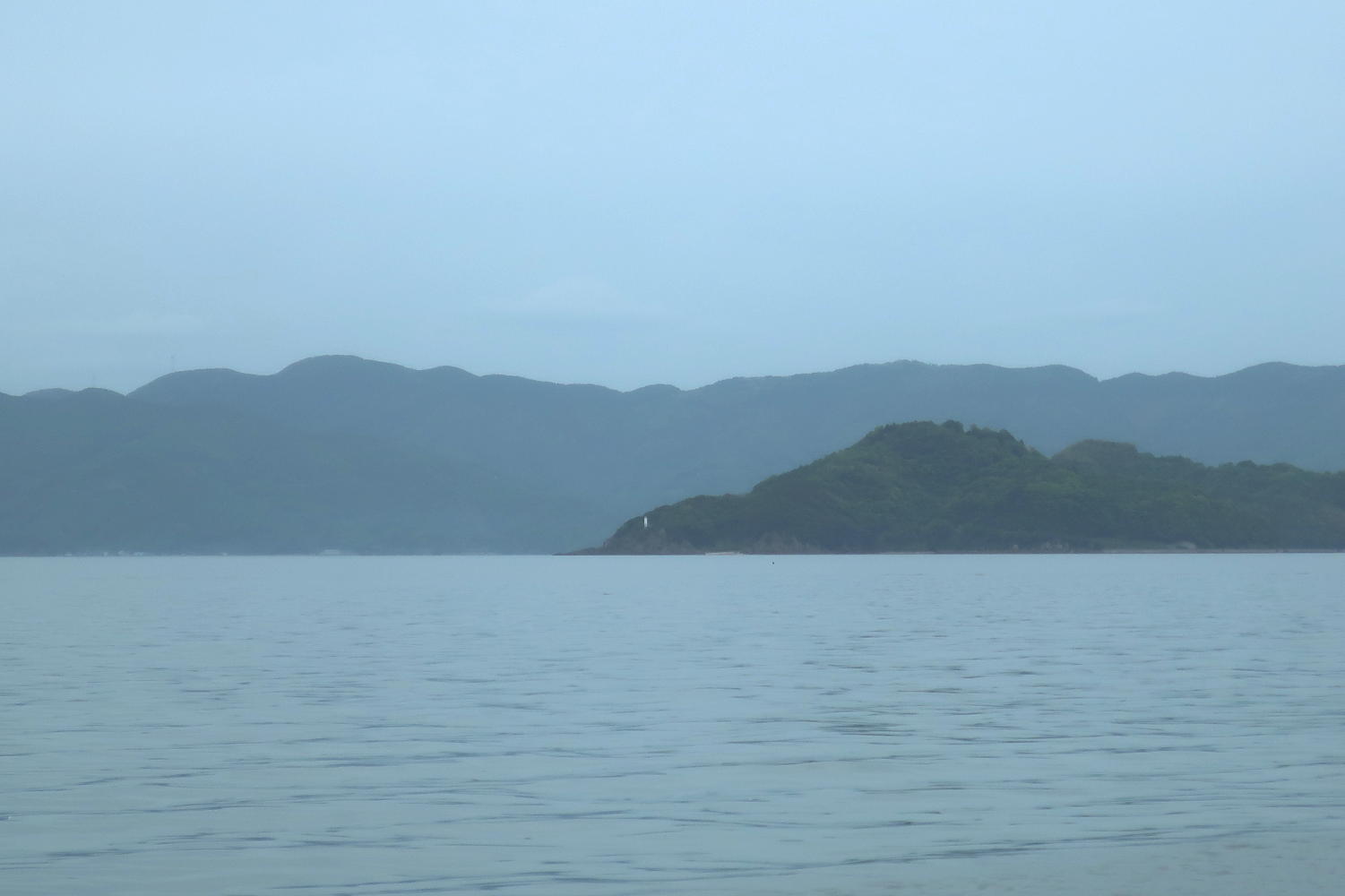 白い縦長のもの(写真中央)がかろうじて見えるが灯台かな? 方向や地形からして大良埼灯台(おおらさきとうだい)と思われる。