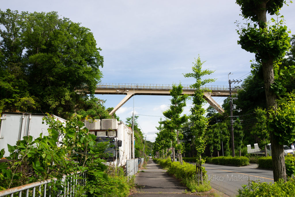 写真ではあまりはっきりとわからないが、肉眼ではちょっと驚くほど上り坂になっていることがわかる。それもそのはず、梅谷交差点の標高は65mでそこから約400m先の標高は85mを超えるのだから、まったく息が切れる。もちろん、機関車だって大変だったろう。