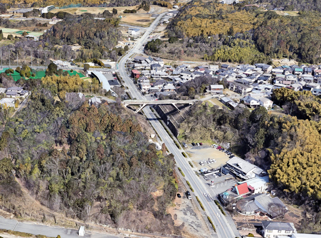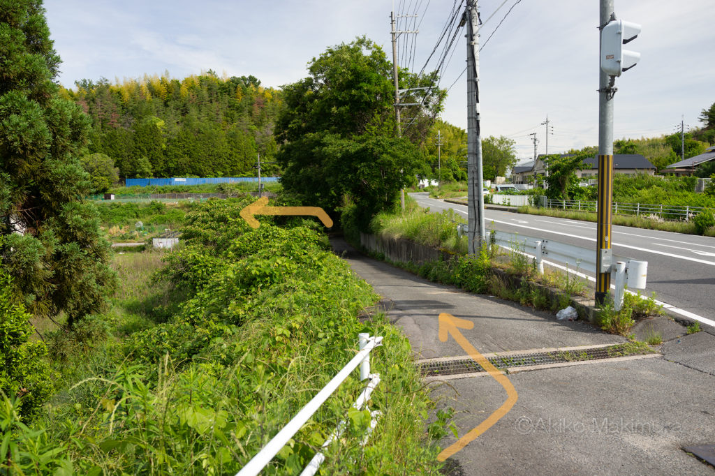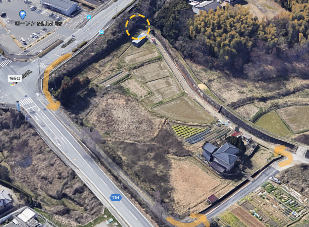 県道44号線を道なりに進み、「梅美台」交差点で右折する。道路は直角に曲がっているが、実際の路線は右カーブをして「梅谷」交差点に続いていたのだろう(下図)。